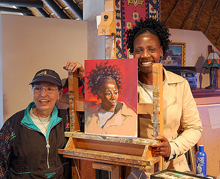 | Judy writes The portraiture workshop was a result of my having consulted with a South African artist, Sonia Jacka, who was painting a portrait of Archbishop Tutu to be auctioned off for housing in the township of Masiphumelele. (Sonia also has created a beautiful and informative web page about the workshop. She was also a wonderful host during my stay. See her elegant description of one of our painting spots below.) Before I left for the trip, my friends in the Akron Society of Artists asked me if I would see Archbishop Tutu, and I told them I couldn't IMAGINE that I would as it is a very big country, he is often away from it, and he is a very busy man. Circumstances conspired to make me late getting to the gate at Heathrow for the plane to Capetown and everybody else had boarded; just as I got to the gate, one other person arrived, also late. I turned and found Archbishop Tutu smiling at me! I told him he was the reason I was going to South Africa. He and I walked down the jetway together, talking art! | |