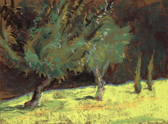 Apple Trees — Domaine du Haut Baran, France Pastel on 6.5" x 10" Canson Touch paper August 2014 Workshop in France, painted left-handed Contact the artist for pricing and availability