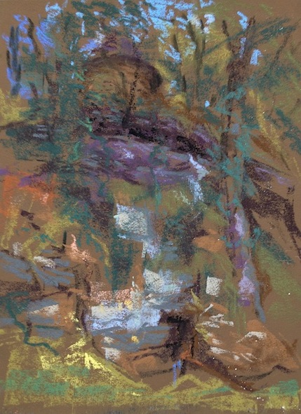 View of the Shepherd's Hut from the ancient spring — Domaine du Haut Baran, France Pastel on 10" x 6.5" Canson Touch paper August 2014 Workshop in France, painted left-handed Contact the artist for pricing and availability