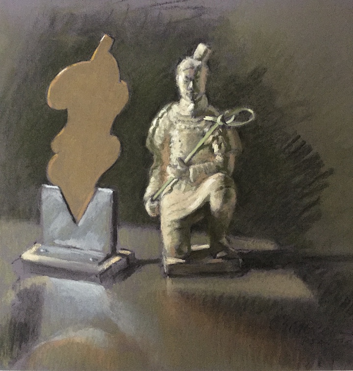 Judith comments "The abstract maquette by the sculptor Jeff Fauser startled me by its resemblance to the figure of the Terra Cotta Warrior I brought home from China. The maquette evokes a torso of Aphrodite to me, so Ancient Greece meets Ancient China. Jeff, equally startled, wonders if he has some Chinese DNA."