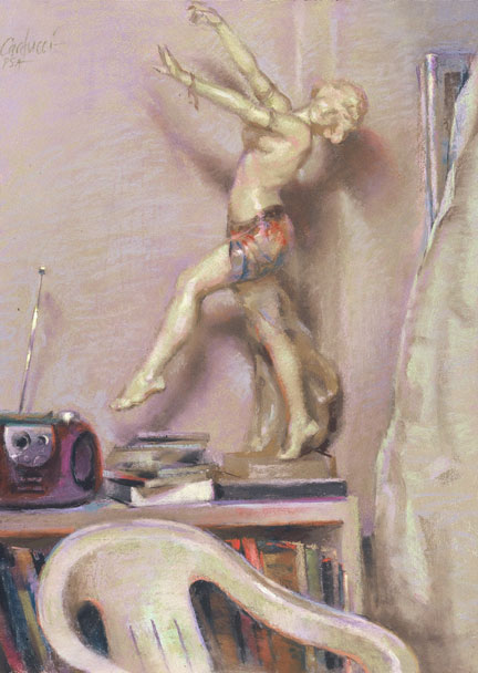 Shadow DancerJudy comments "This won a Best of Show. The marble statuette has long been in the ASA studio storage area; somebody had moved it out of the way to clean the area. The shadows and silvery grays and warm buffs, the plastic chair contrasting with the dated statue and old boom box captured me. She looked as if she'd just danced out from behind the curtain to the music of the boom box." Pastel on 24" x 19" Ampersand pastel board Private Collection |