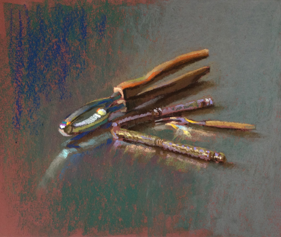 Vanitas :: "Tools— Claw Crackers & Lobster Pick" Pastel on 10" x "10.5" Canson Touch paper Top row L to R: "Alive"," Transit"," Dead" Bottom row L to R: "Lemon","Lobster Cove","Tools"