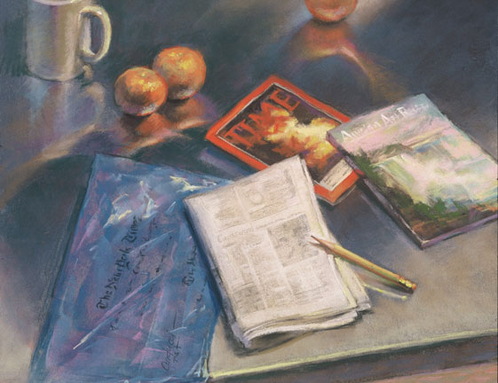 War and PeacePastel on 24" x 30" Ampersand pastel board Judy comments "I came home one evening to find this spontaneous still life on the stainless steel kitchen table, and was so taken with it that I painted it on the spot. The Time cover told of the beginning of bombing in Iraq. The peaceful landscape on the art magazine, the coffee mug and the NY Times crossword puzzle all told of the contrasting security of my home, which touched me deeply." |